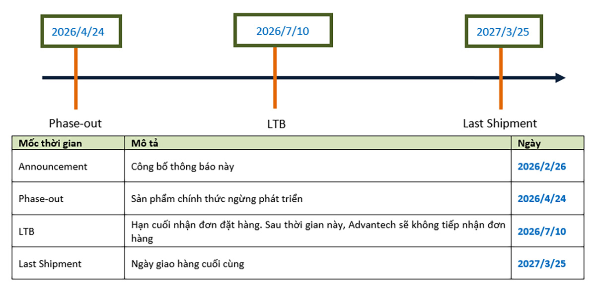 Advantech chính thức thông báo ngừng vòng đời (End of Life – EOL) đối với dòng sản phẩm ECU-4784 series, bao gồm các T-P/N và CTOS P/N liên quan. Các mã hiệu sản phẩm sẽ ngừng vòng đời tương ứng được liệt kê dưới đây. Những khách hàng đang sử dụng các Part Number này nên đặt thêm hàng dự phòng trước thời điểm đặt hàng cuối cùng, hoặc cân nhắc chuyển sang các model thay thế mới nếu có thể.